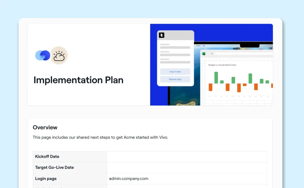 List the most important dates like the onboarding kickoff, implementation checkpoints, training sessions, QBR dates, or integration deadlines. We recommend that they live in two places: