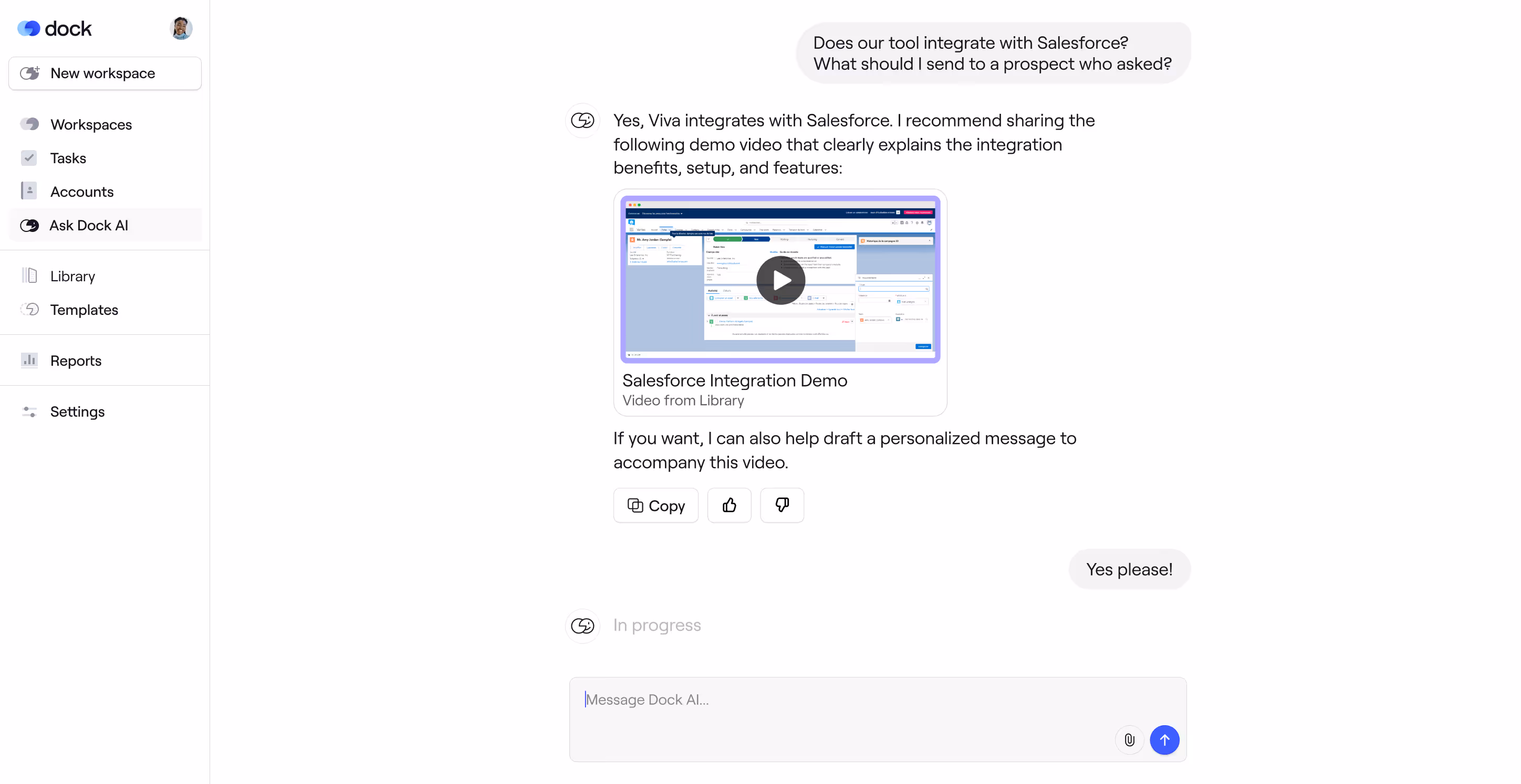 Just connect your CRM, content library, and call data. Dock AI does the rest. No DIY workflows required.