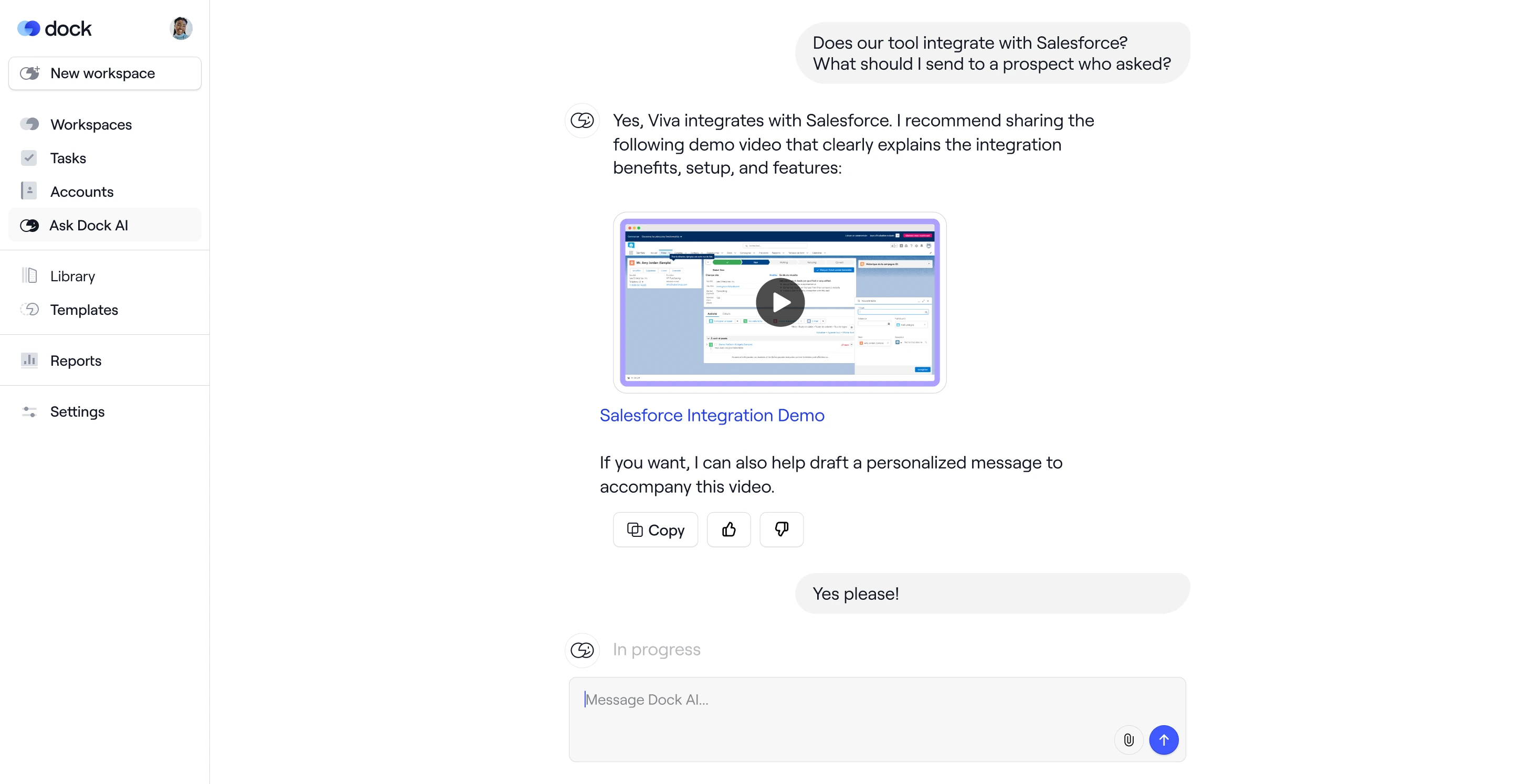 AI-powered sales deal rooms. Instead of scattering links and attachments across email threads, reps can use tools like Dock to create personalized digital sales rooms that consolidate everything a buyer needs in one place—pricing, case studies, implementation plans, and next steps.