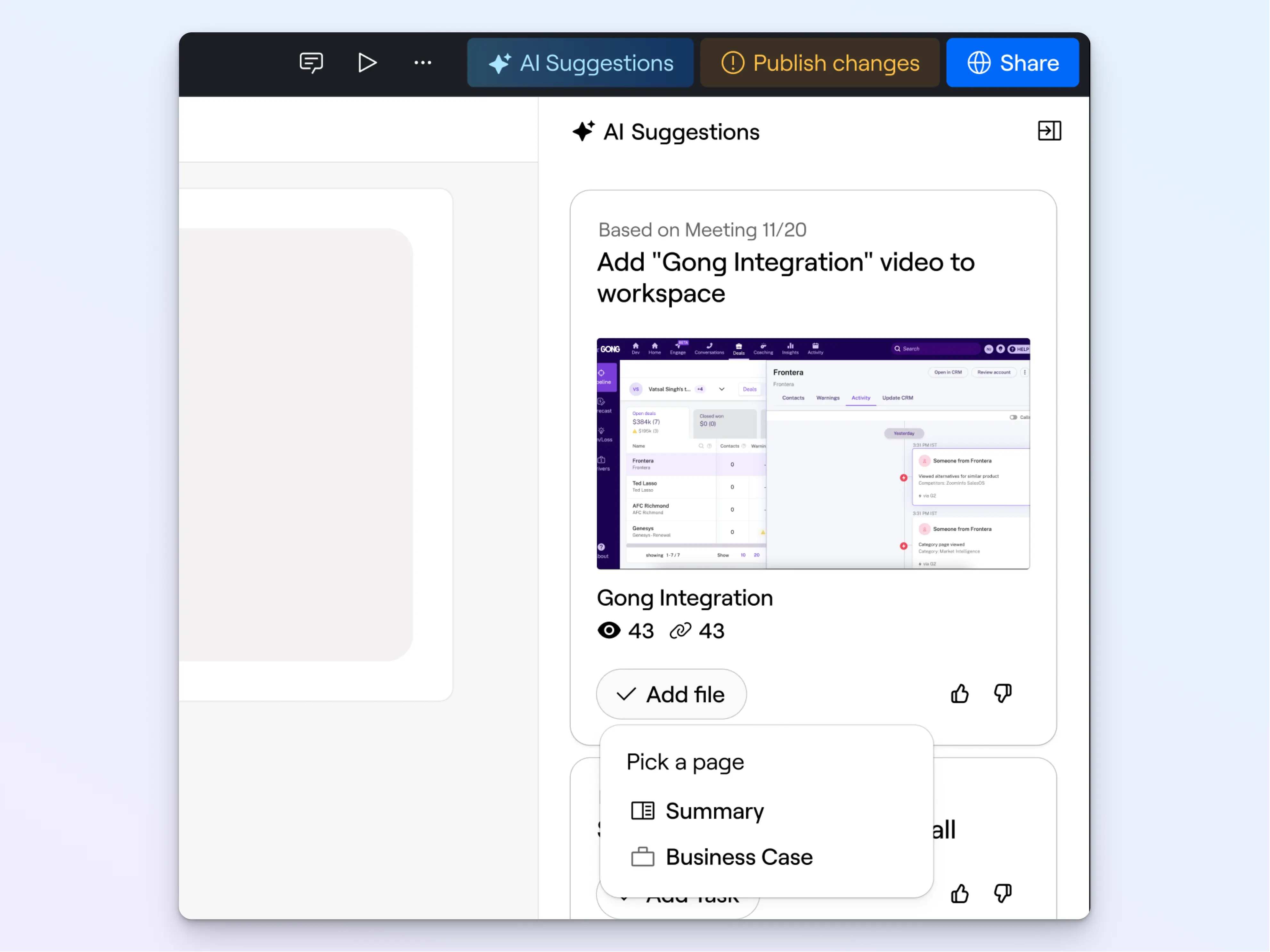 Dock AI now suggests updates to a client's workspace—whether it's a sales deal room, onboarding hub, or client portal—based on recent calls.