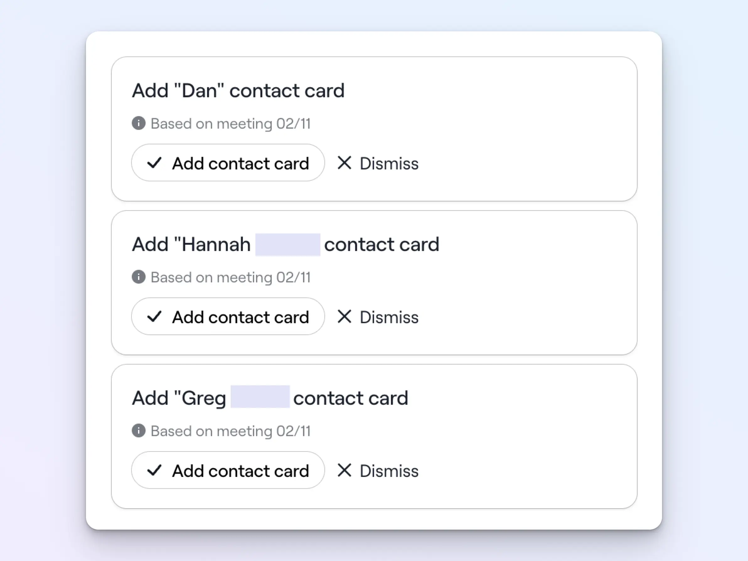 When new stakeholders come up in conversation, Dock AI suggests adding their contact cards to the workspace—keeping your key contacts up to date without manual data entry.
