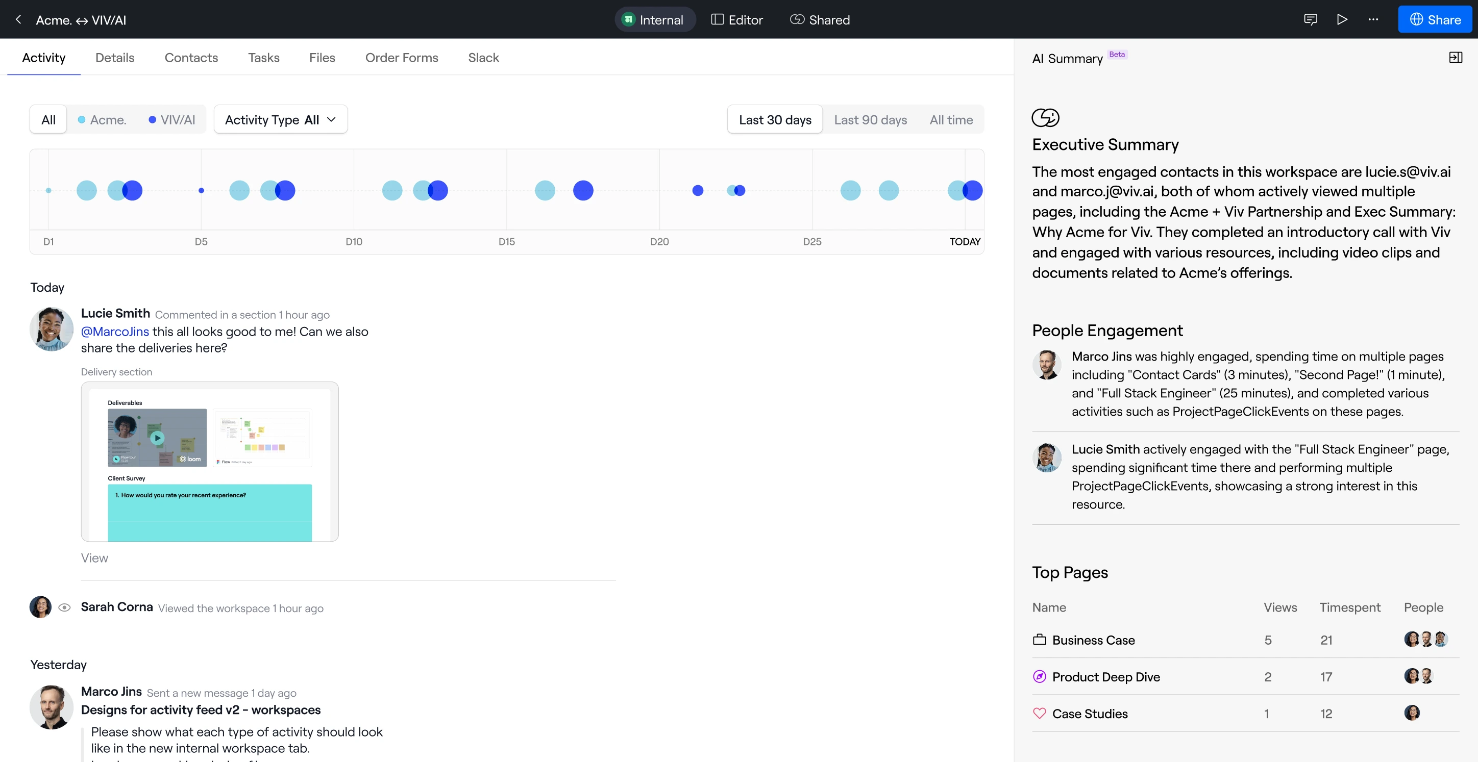 - Get AI summaries of buyer activity and deal momentum to stay ahead of friction