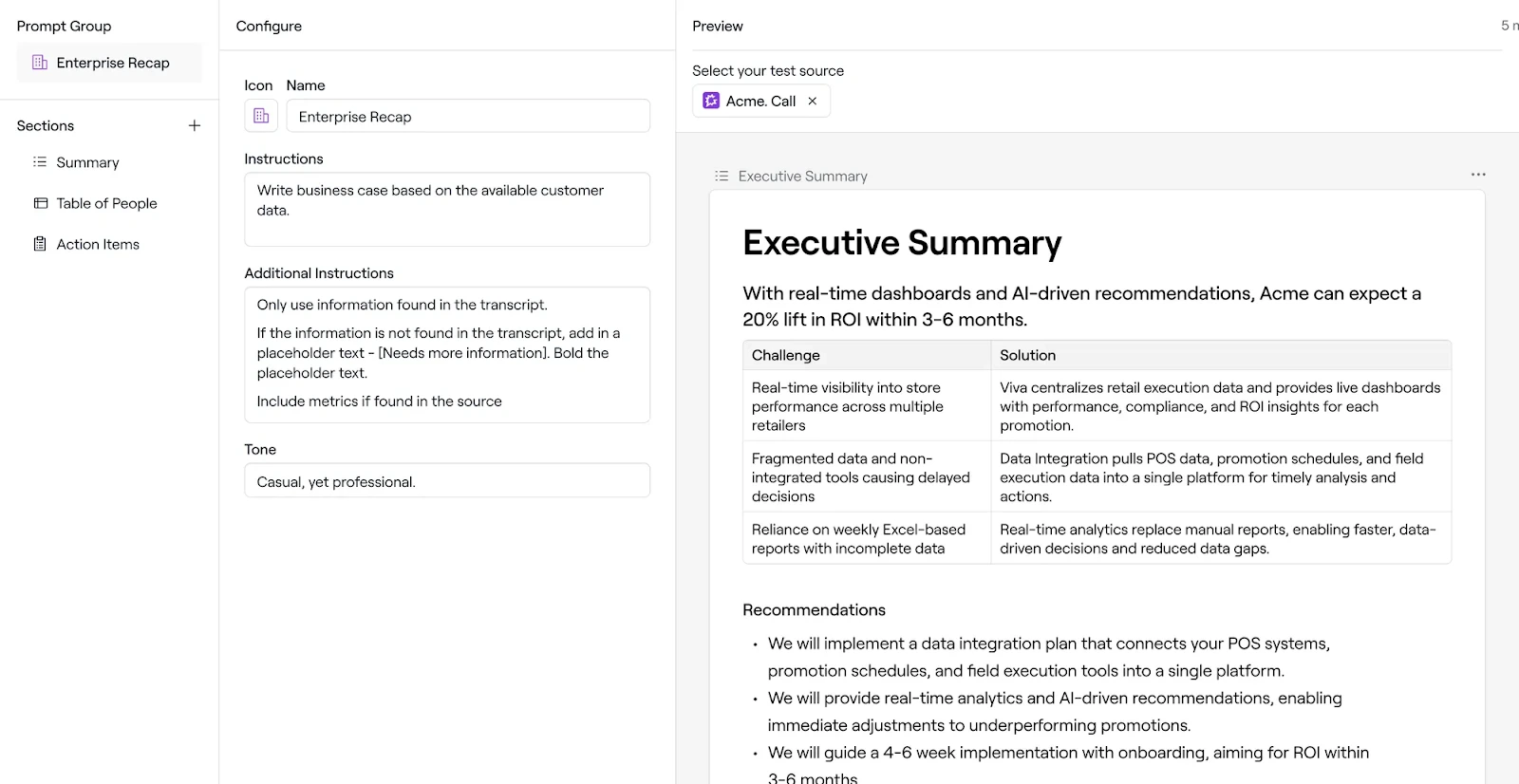 Enablement teams can create prompt-driven templates for business cases, QBRs, action plans, and more—automatically pulling in context from CRM data, call transcripts, and workspace history.