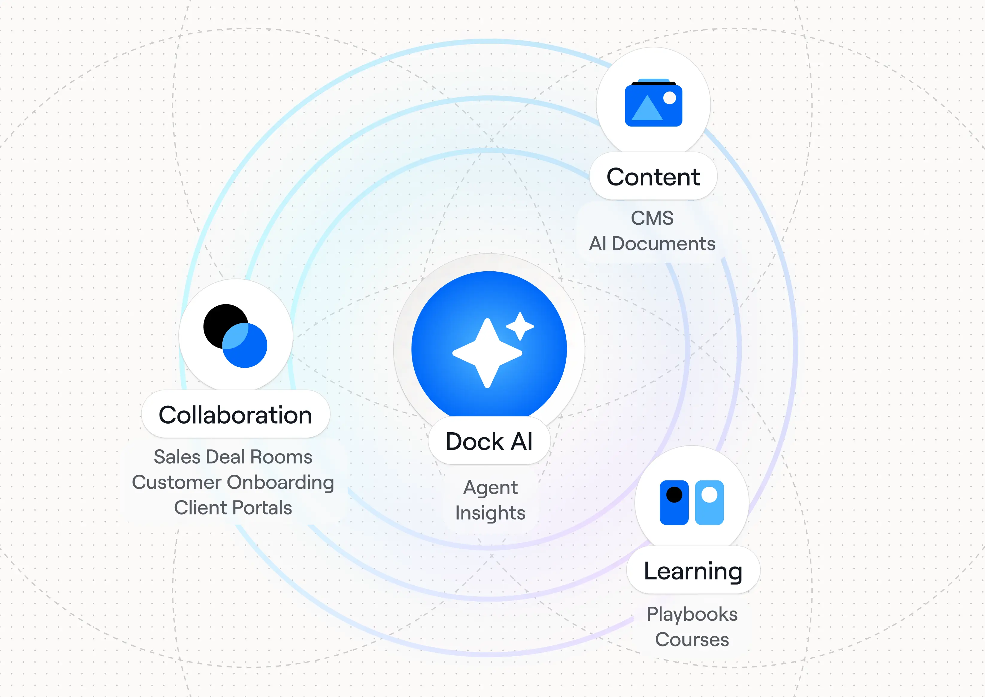 Dock is an AI revenue enablement platform built around three pillars: collaboration, content, and learning. The unifying idea is that enablement should work for the whole revenue team—and for your buyers—not just internal sales reps.