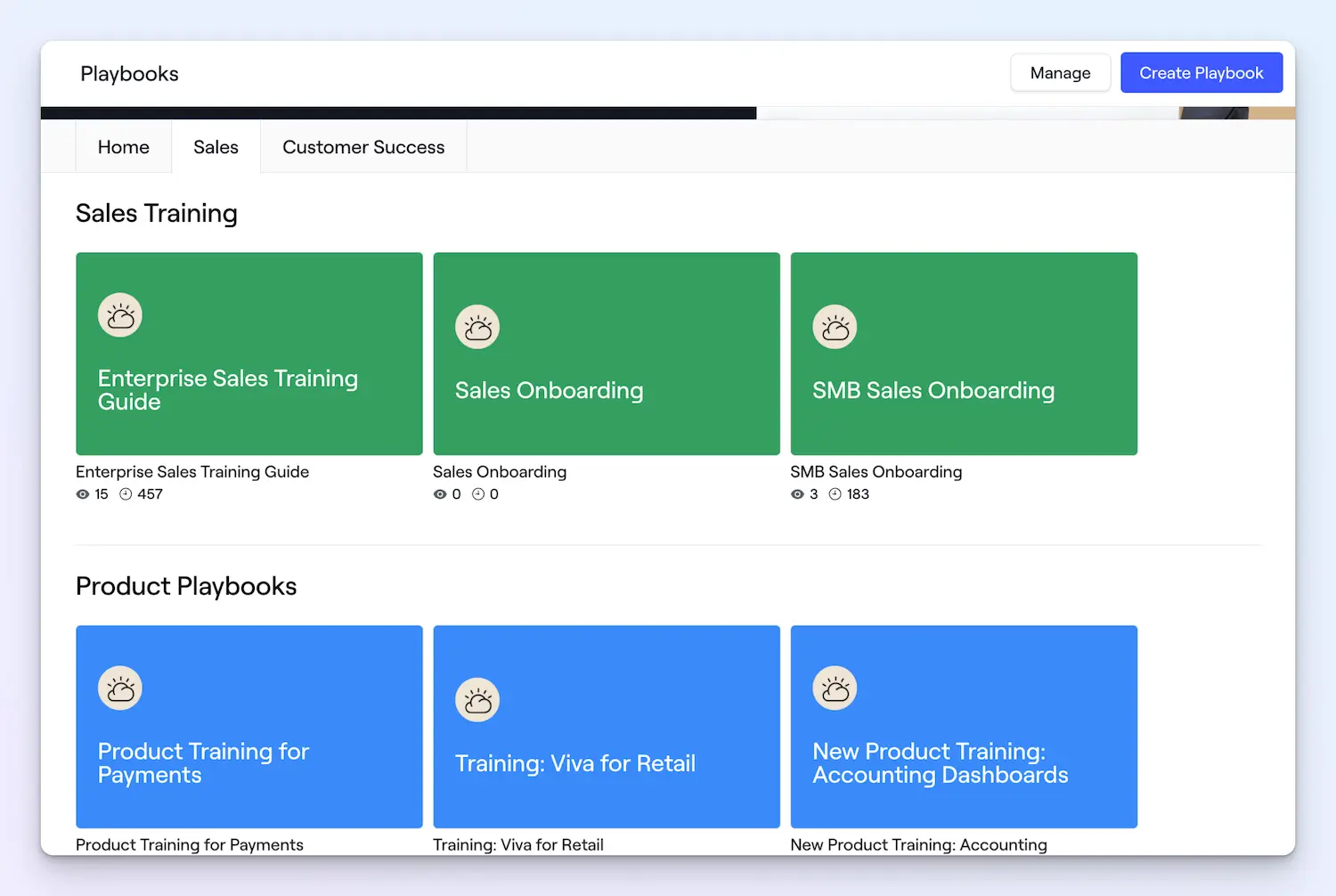 Views are essentially tabs for displaying your playbooks. Think of them as dedicated destinations for reps to easily find training materials. You could create views for: