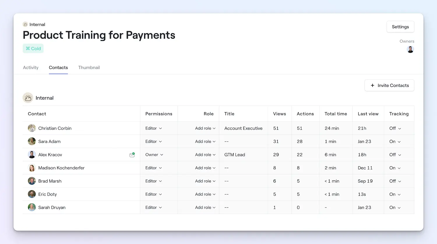 Content engagement analytics show which internal assets and videos get the most views within your playbooks—and which ones get ignored.