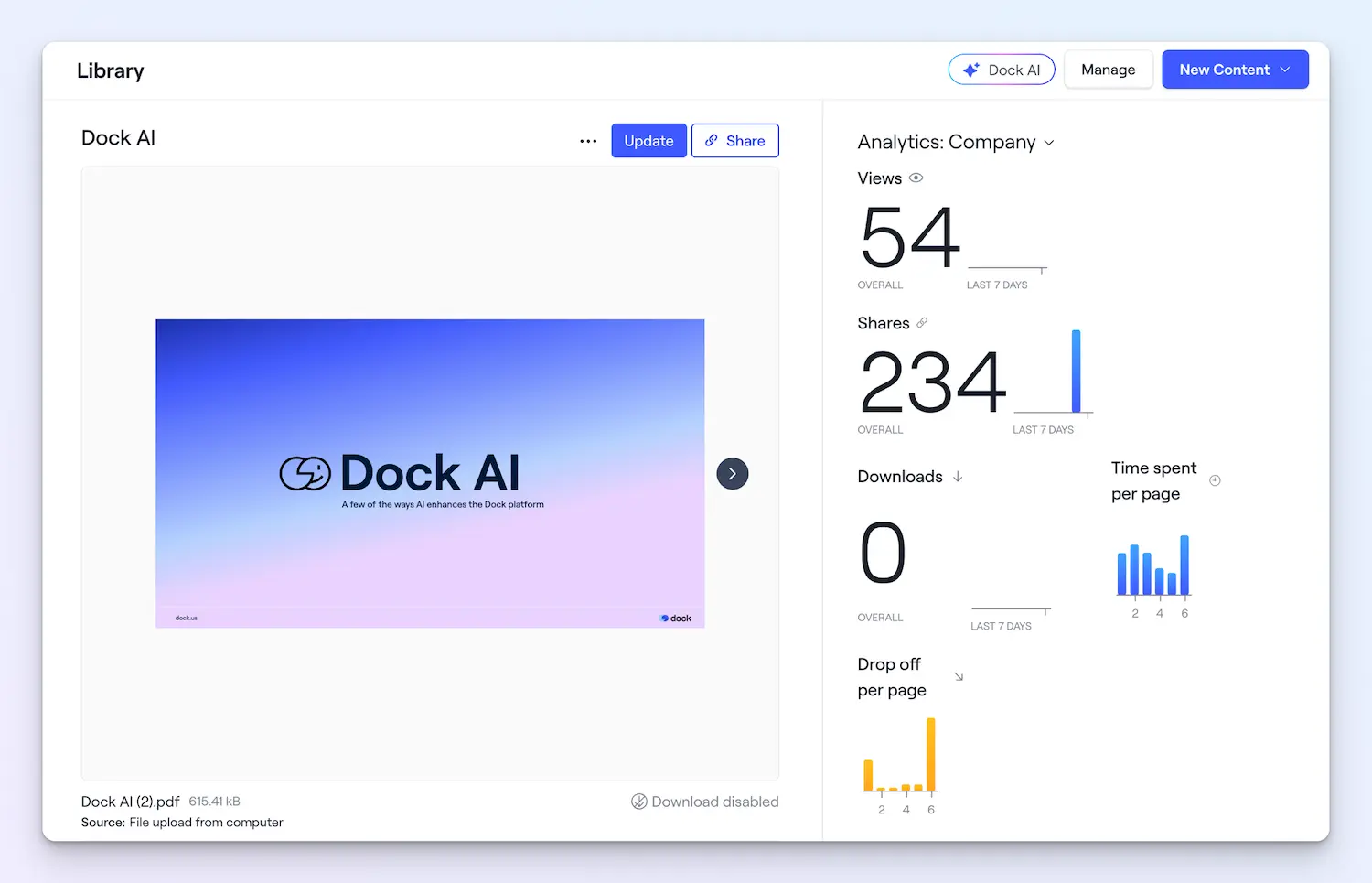 Playbook engagement analytics—just like Dock workspace analytics—give you a feed of who's viewing and engaging with what, plus roundups of overall engagement.