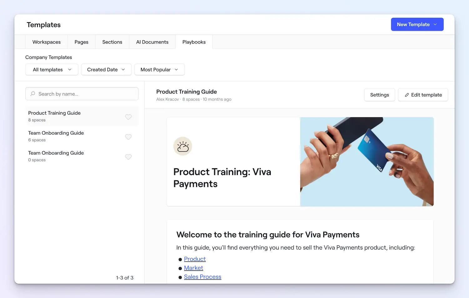 Just like you can create workspace templates for repeatable customer workflows, you can also create playbook templates for repeatable training.