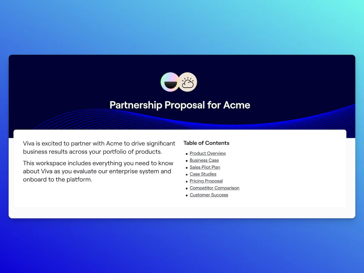 Build in variables—like {{account.name}} or {{primary_contact.title}}—so details auto-populate when a rep creates a new workspace. This ensures every proposal feels personal without sacrificing control or adding unnecessary work.