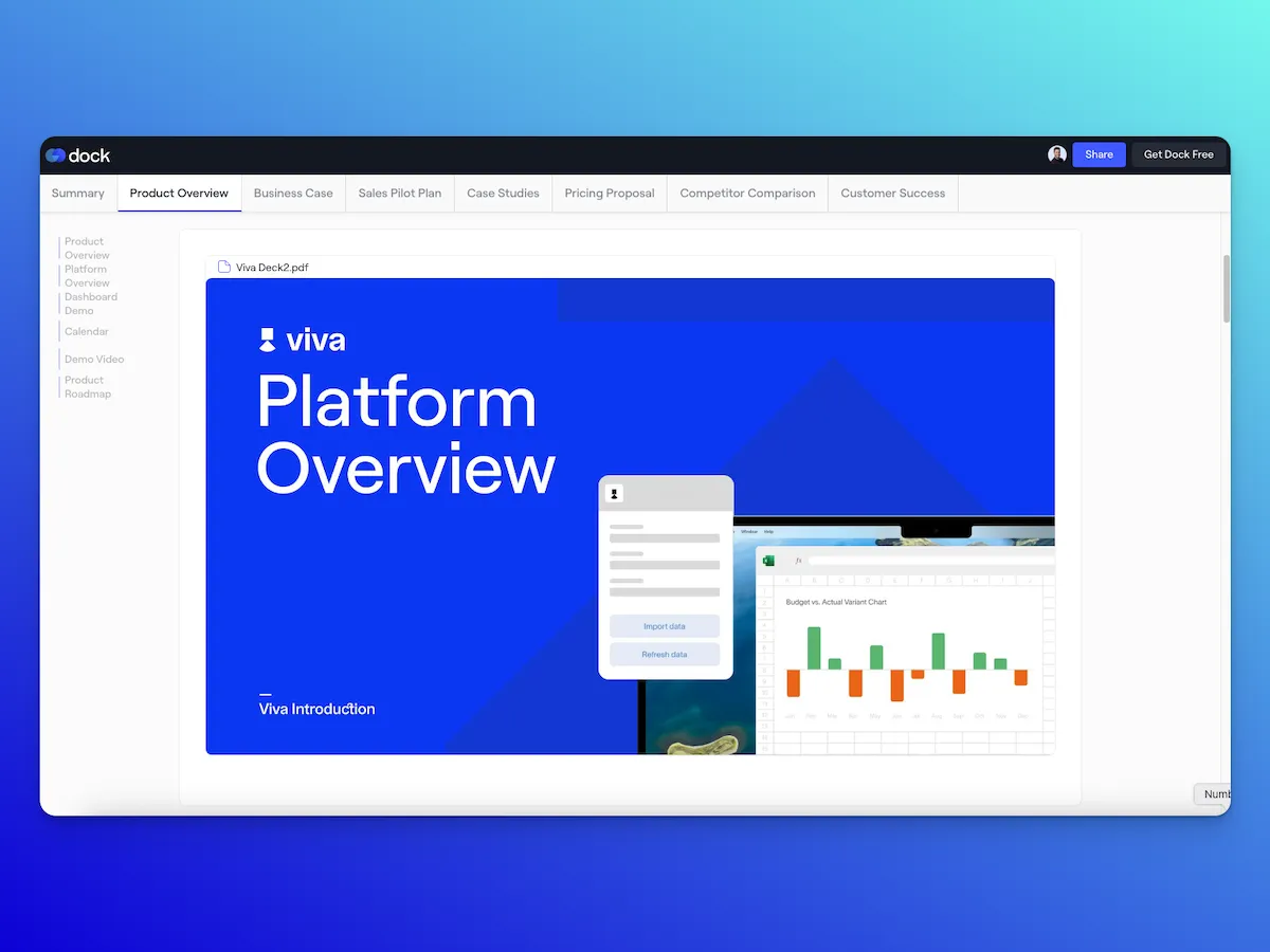 PDFs get lost in inboxes, are impossible to update, and give you no insight into buyer engagement. Instead, use Dock’s digital sales rooms—private, trackable microsites that organize all your deal content in one place. Send a single link, and your champion can easily share it with their buying committee.