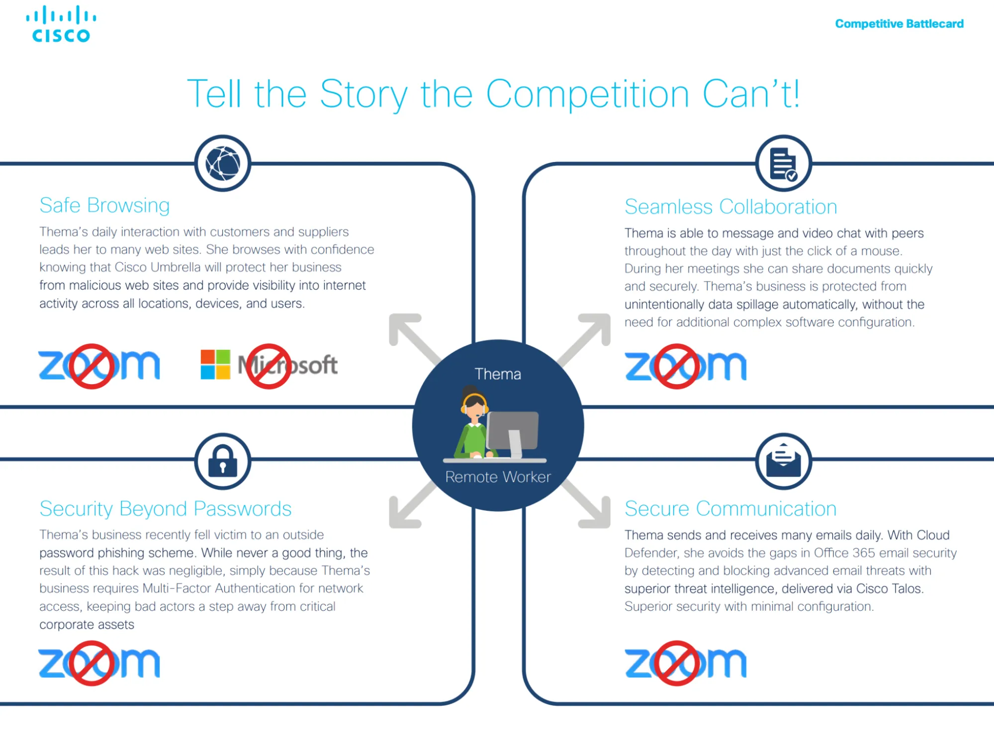 - Cisco doesn’t try to out-Zoom Zoom. Instead, the battlecard reframes the decision around end-to-end security and control across browsing, collaboration, identity, and communication.