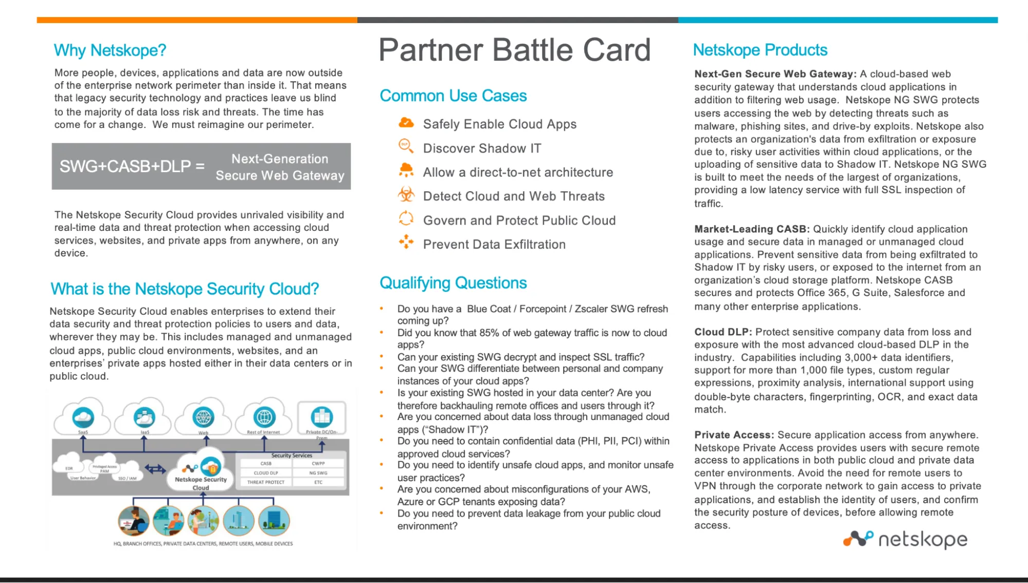 The Netskope Partner battlecard is designed for channel partners competing against legacy web gateways and cloud security tools such as Blue Coat, Forcepoint, Zscaler, McAfee, and Symantec.