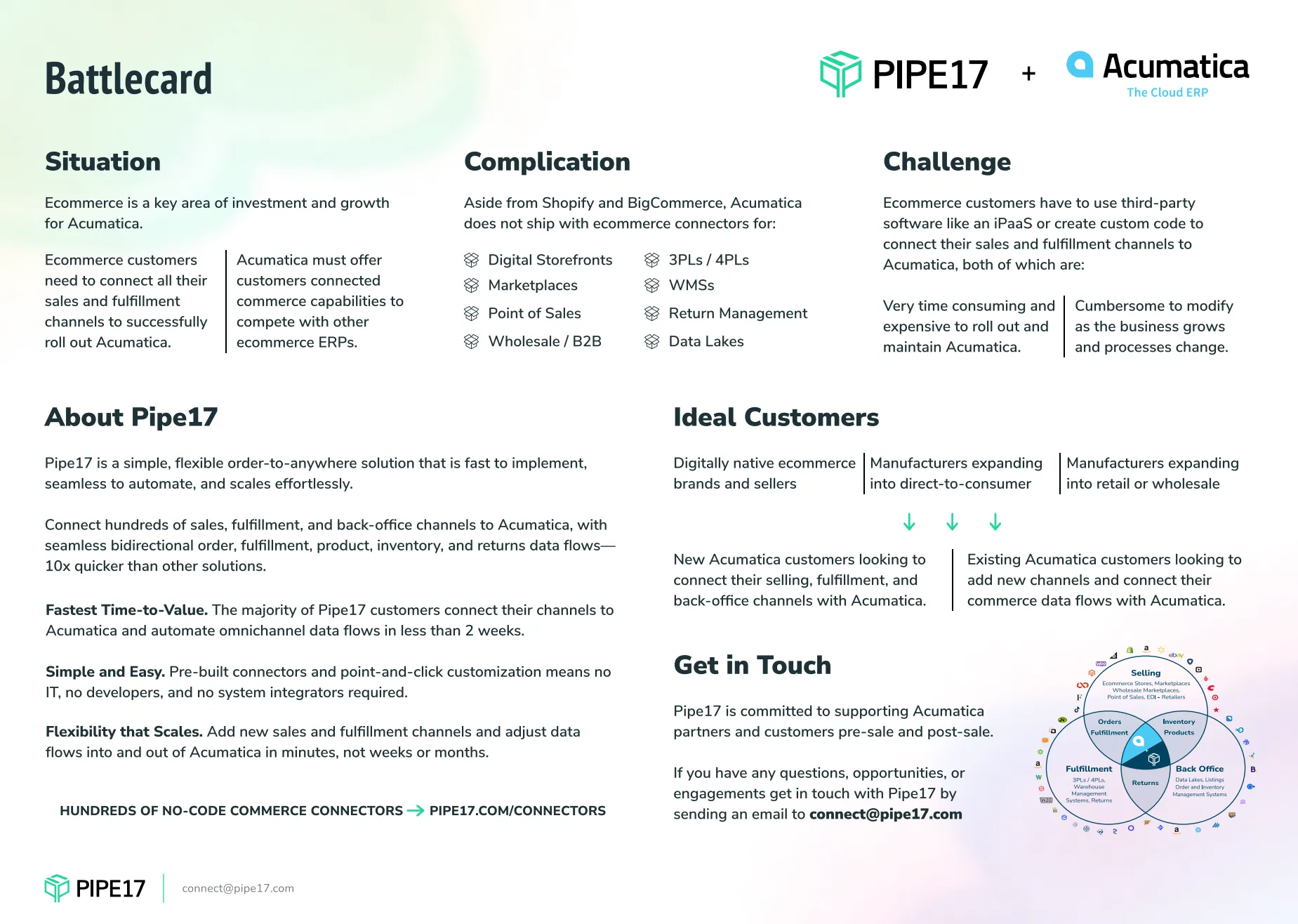 Pipe17’s partner-facing sales battlecard is built to help Pipe17’s partners sell its ecommerce operations platform to DTC and multichannel retailers.