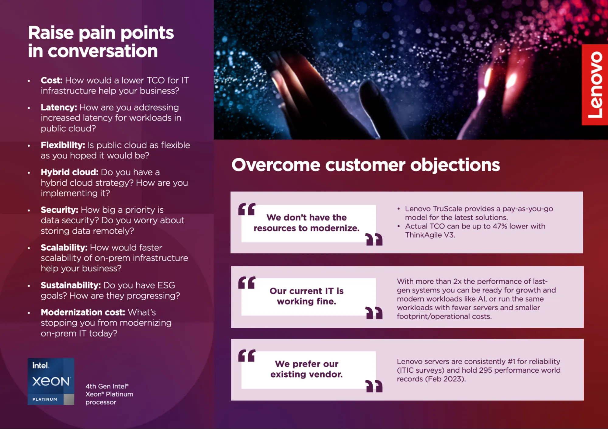 - The card spells out specific questions to ask—about hardware age, security exposure, cloud plans, and workload growth—so partners don’t have to invent their own talk tracks.