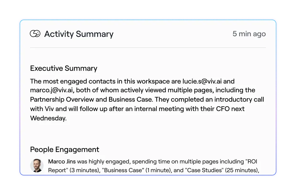 Unlike scattering content across email threads, Slack messages, and forgotten file shares, a sales room gives both sides a organized hub to reference throughout the sales cycle. Buyers can loop in stakeholders, revisit key materials on their timeline, and move the deal forward without digging through their inbox. Sellers get visibility into what's resonating, who's engaged, and where deals might be stalling.