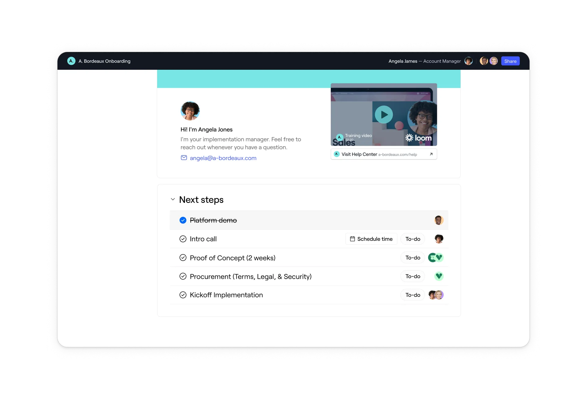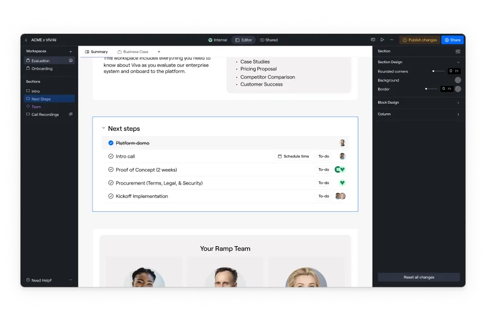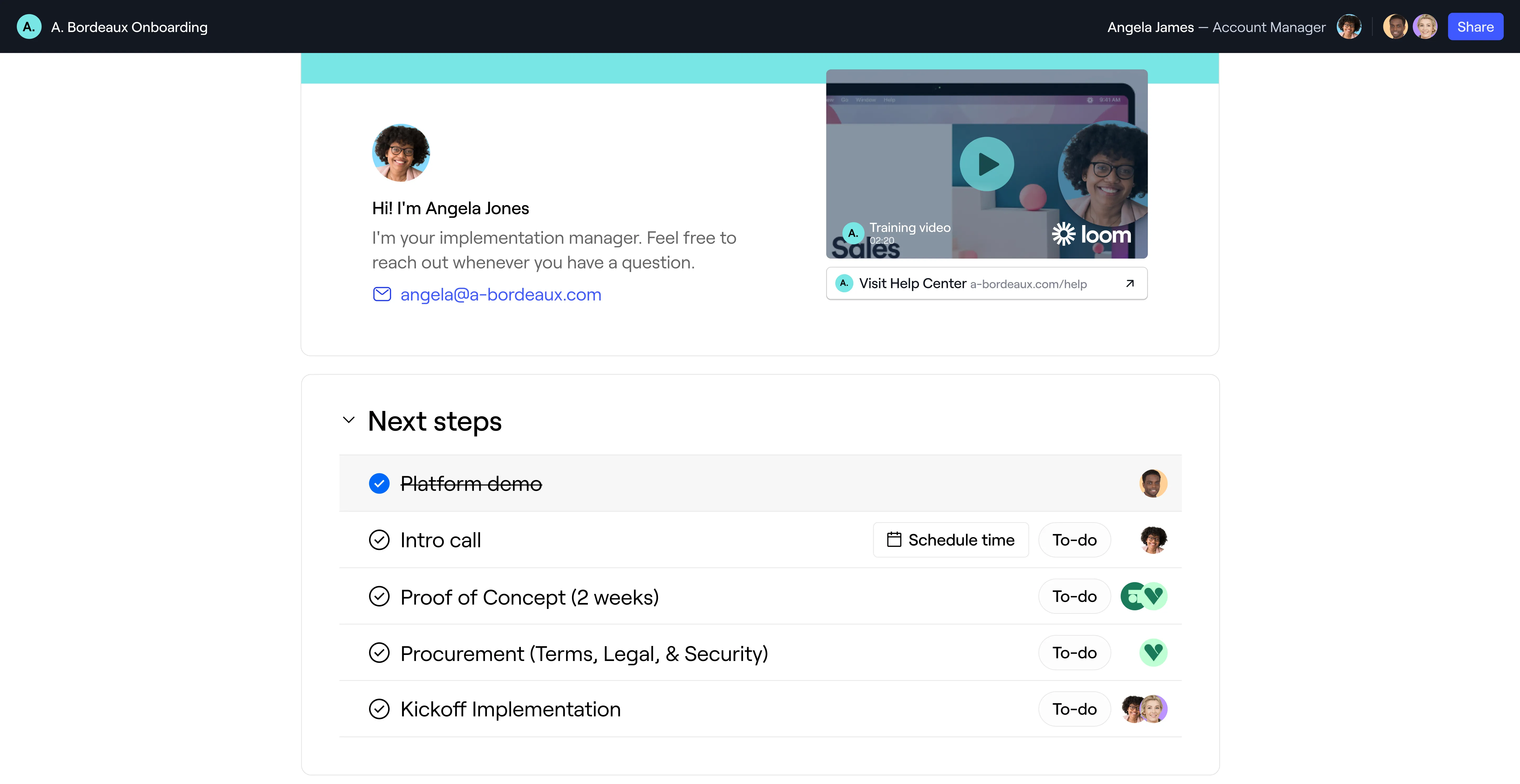 Other sales rooms claim they support onboarding, but in reality, they only provide basic checklists. Dock includes actual project management capabilities purpose-built for onboarding: automated tasks tied to your CRM, relative due dates, progress dashboards, and completion reporting. The same workspace that closed the deal becomes your customer's implementation hub—no awkward handoff, no asking them to learn a new tool.