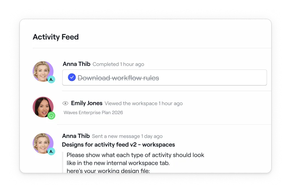 - Create workspaces directly from your CRM and automatically populate them with dynamic fields like account names, logos, emails, and key dates