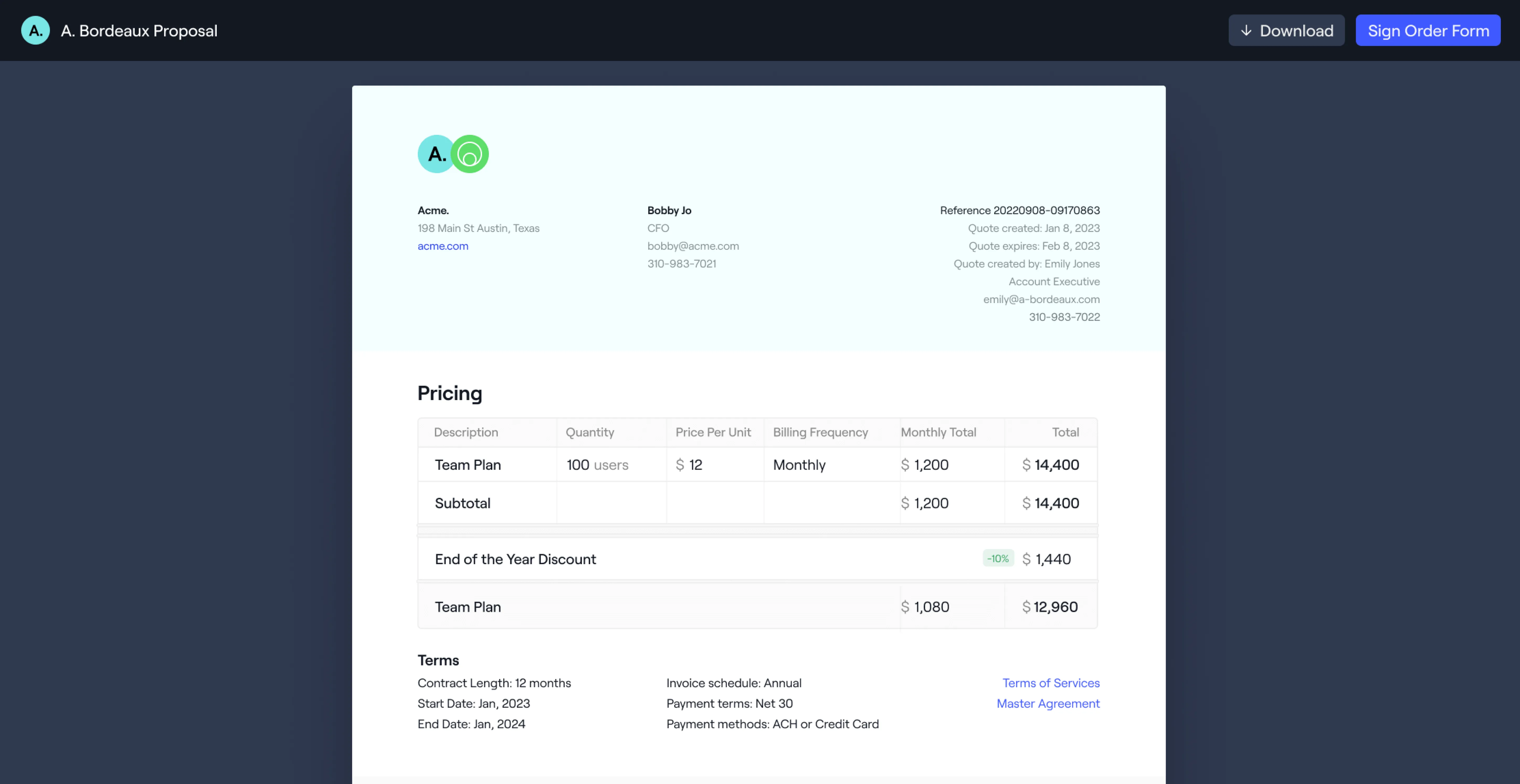 Dock supports the full range of sales cycles from SMB/transactional to mid-market and enterprise deals. The main difference is the type of template that an AE would use with prospects.