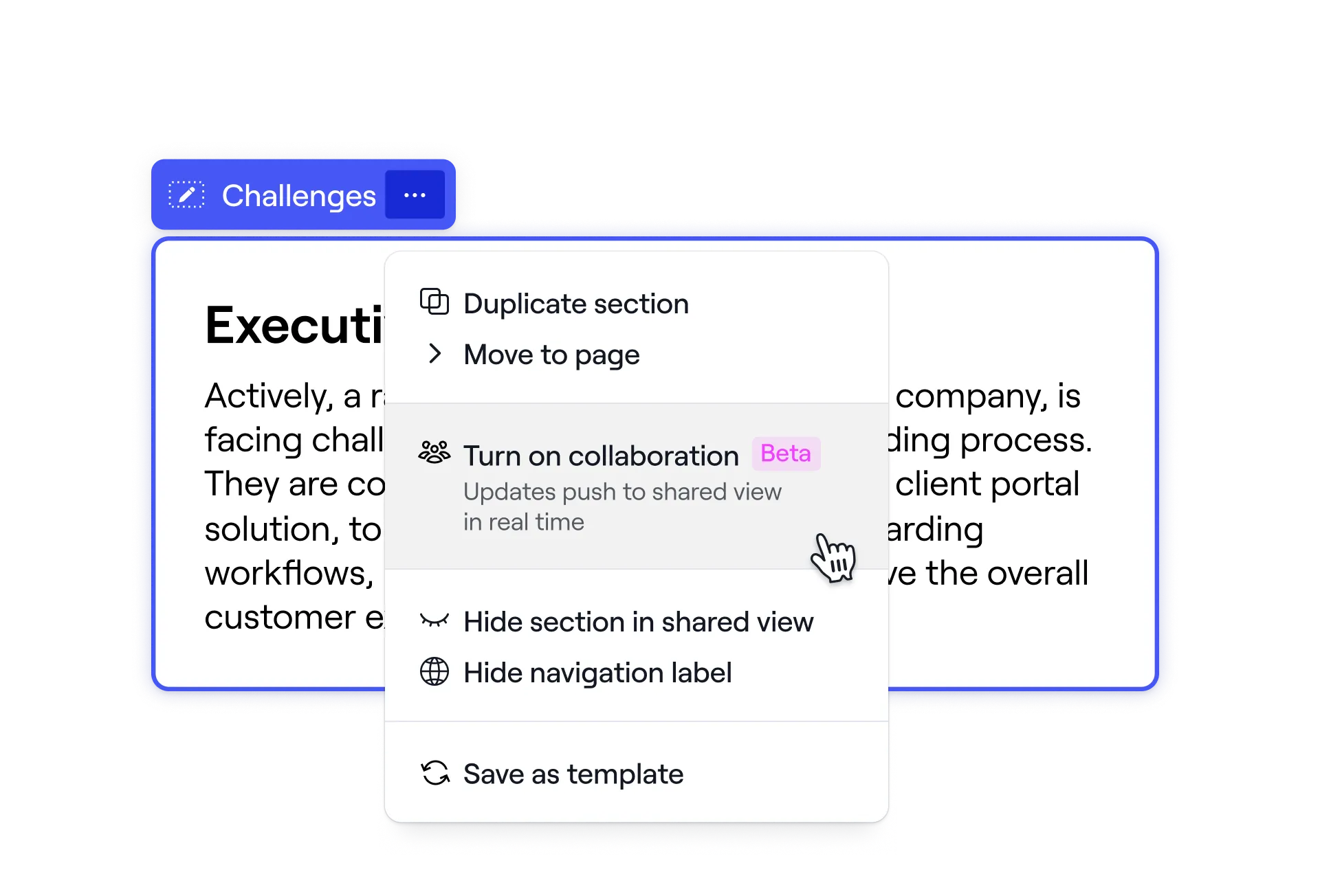 Instead of forcing clients to continually search for materials in email attachments, sales professionals can instead provide a single link to a collaborative and engaging workspace, constantly updated in real-time.